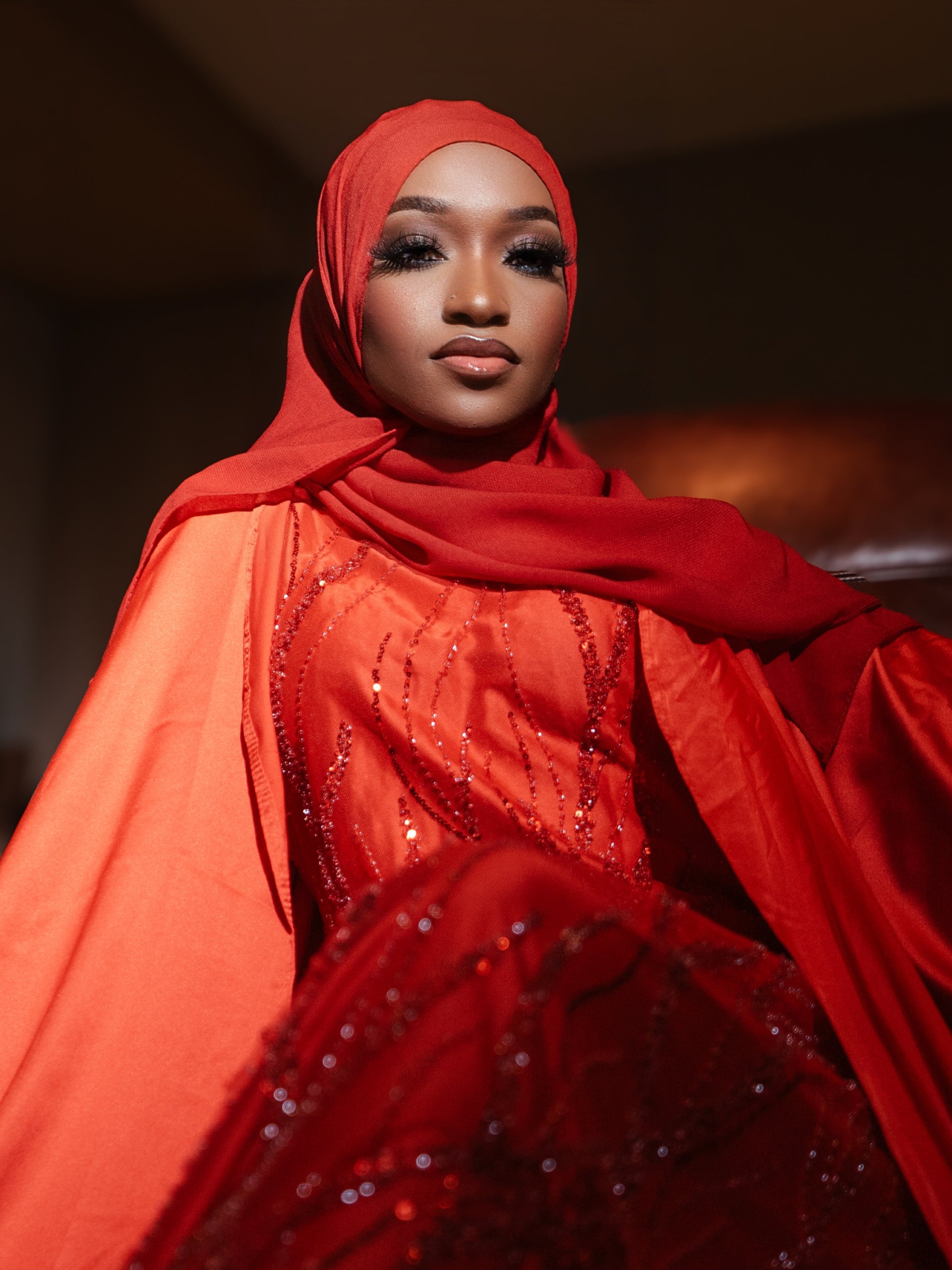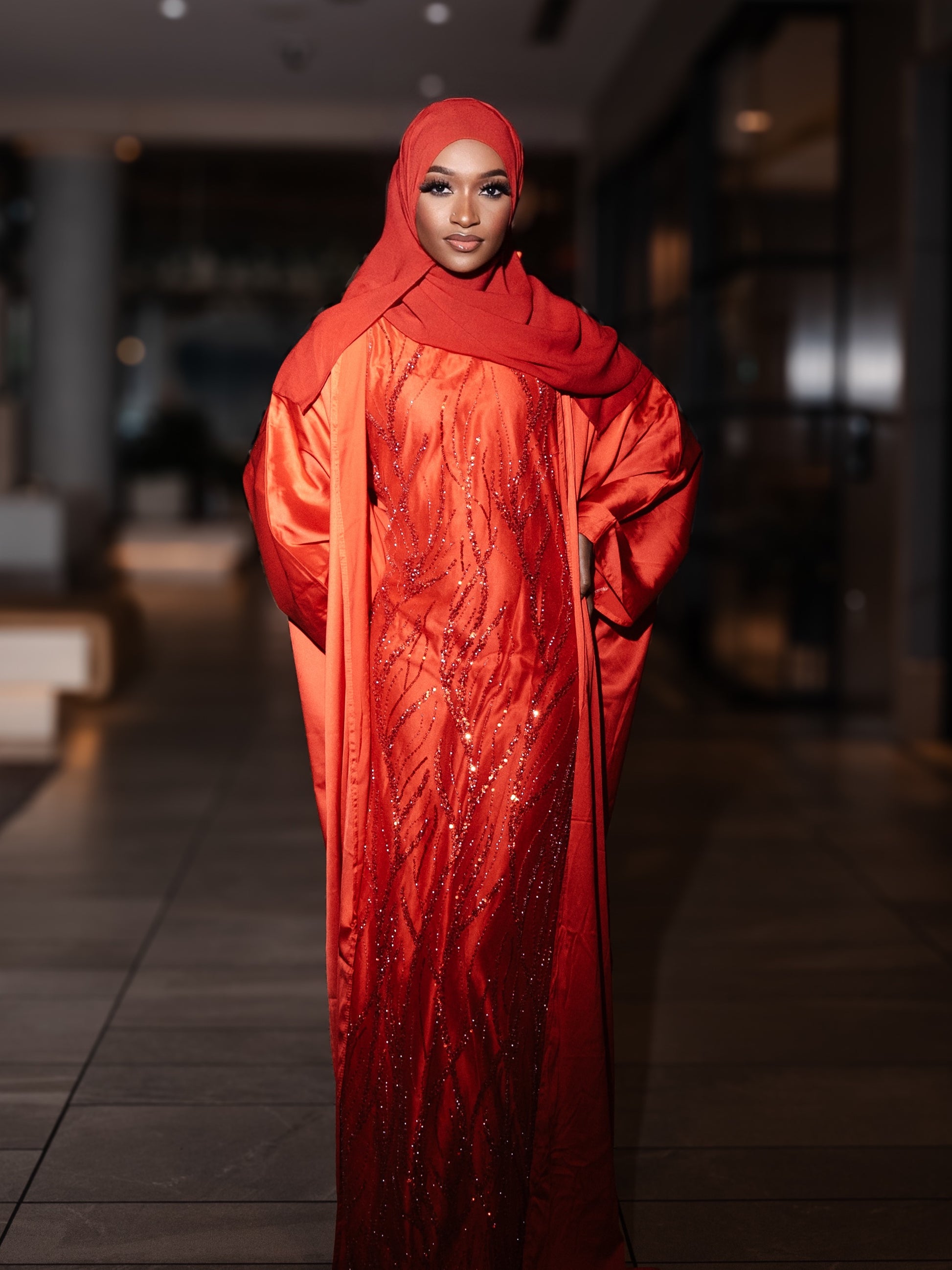Three piece heavily beaded abaya. Comes with inner adjustable dress, outter abaya and matching scarf.
