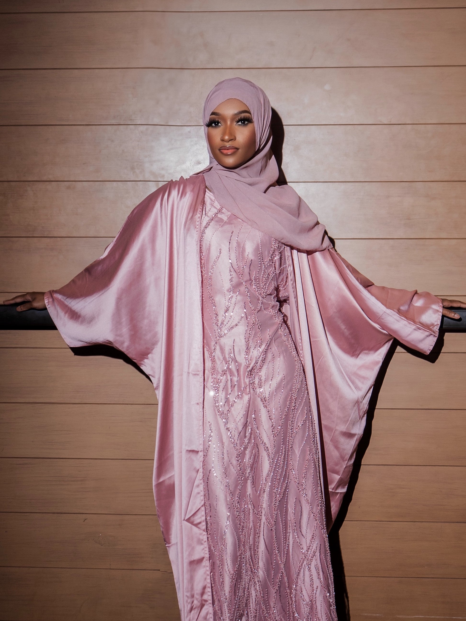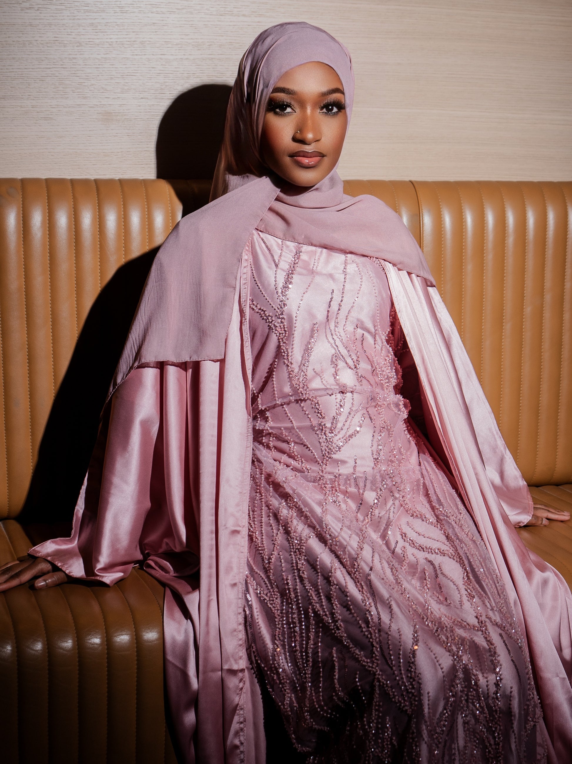 Three piece beaded abaya. Comes with inner adjustable dress, outter abaya and matching scarf.