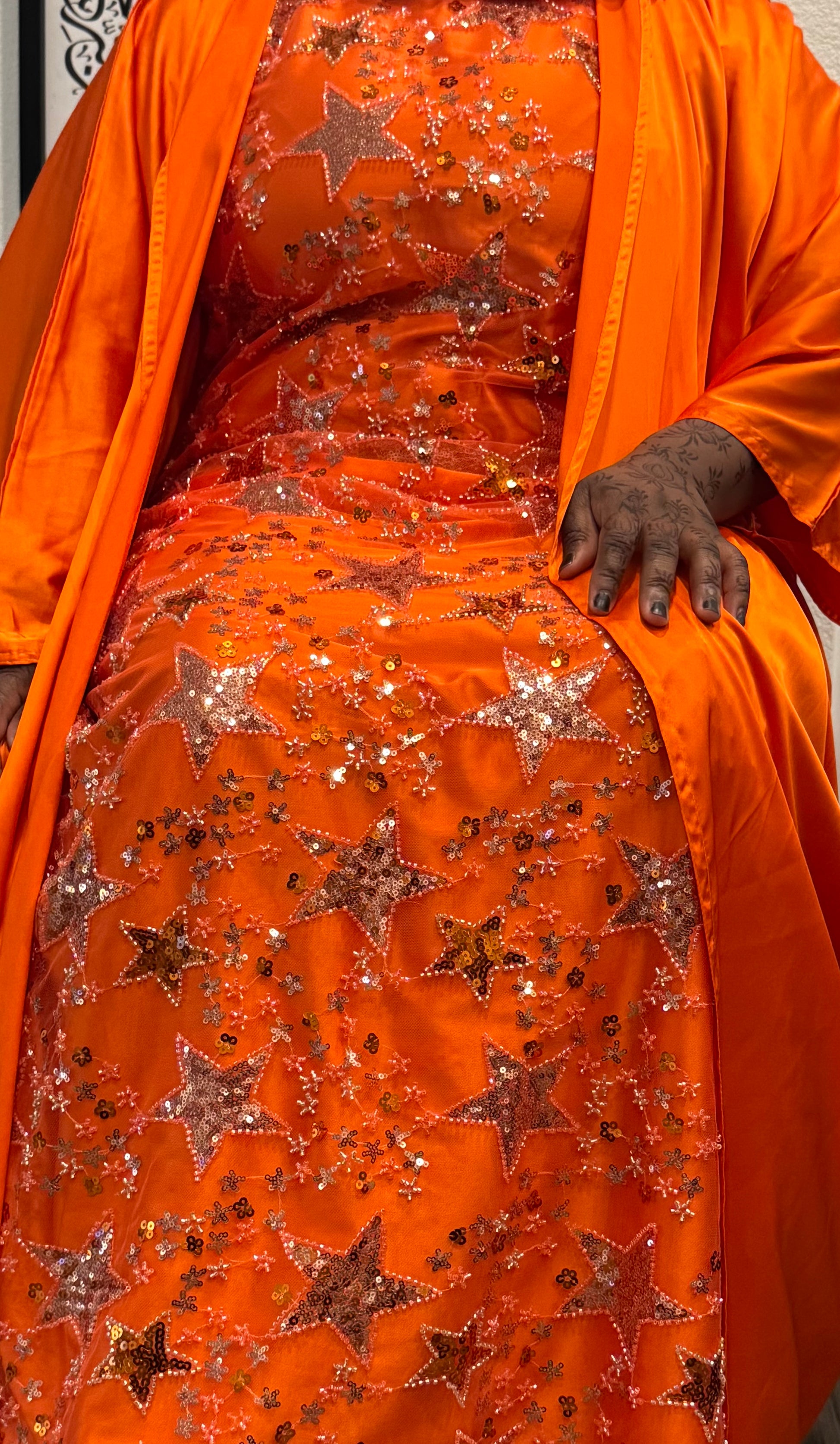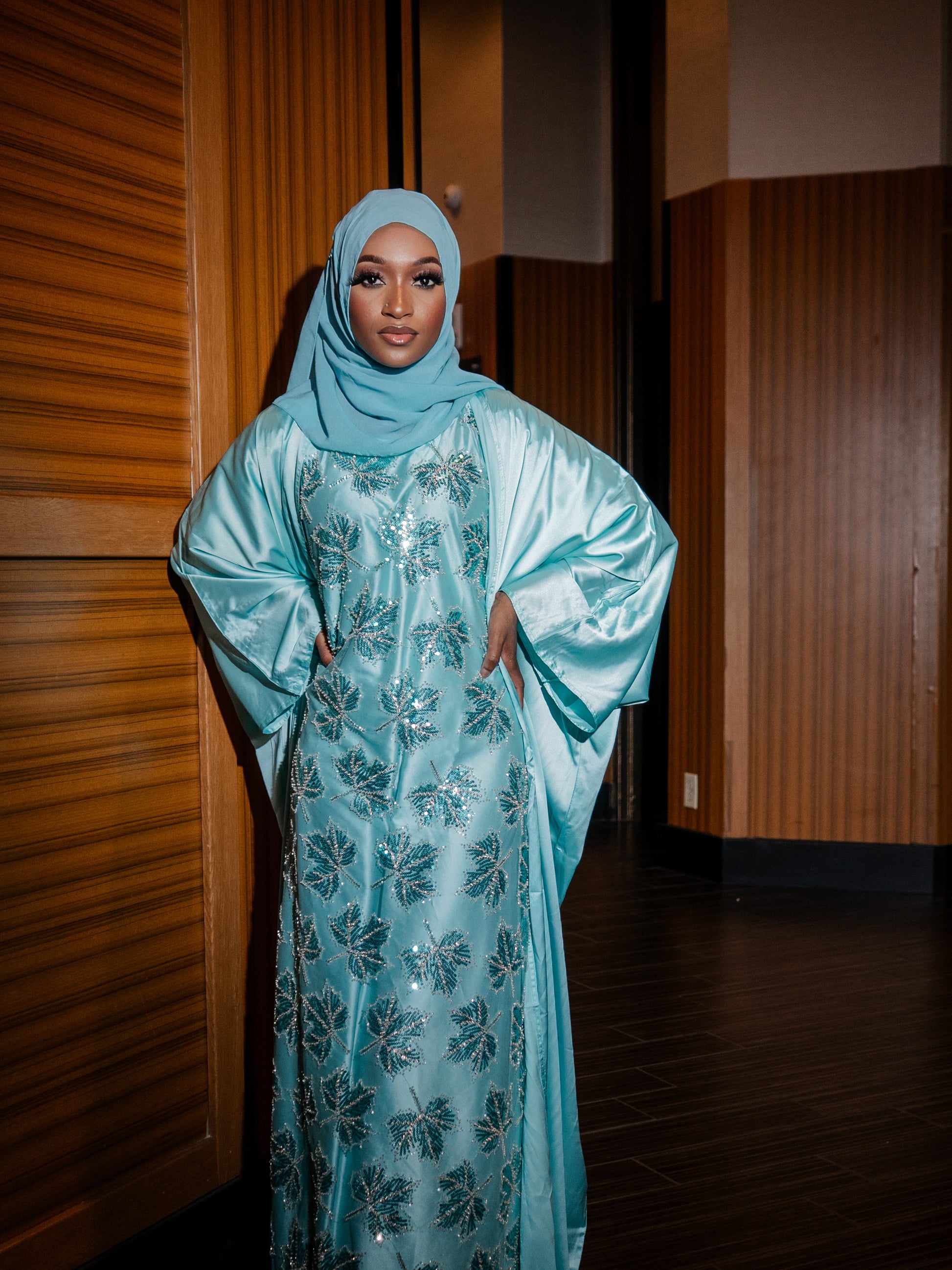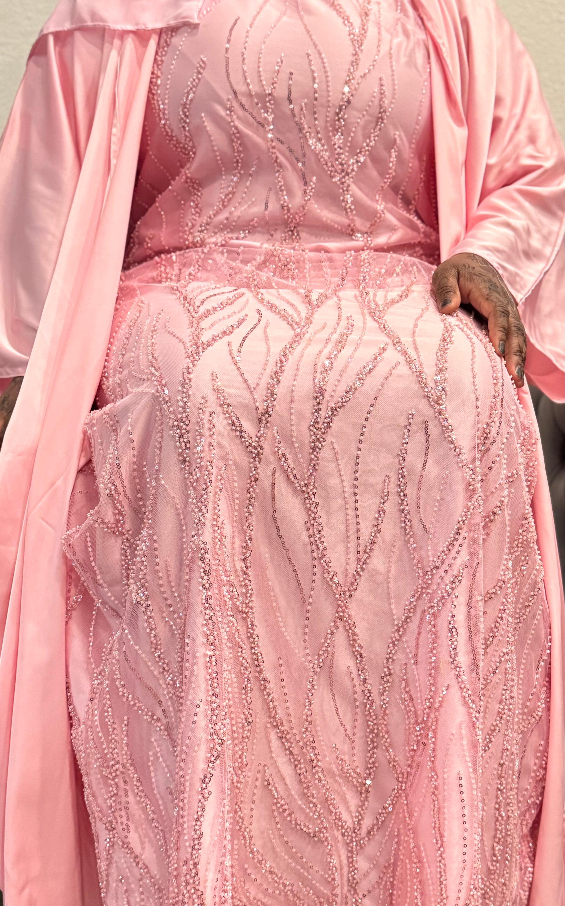 Three piece beaded abaya. Comes with inner adjustable dress, outter abaya and matching scarf.