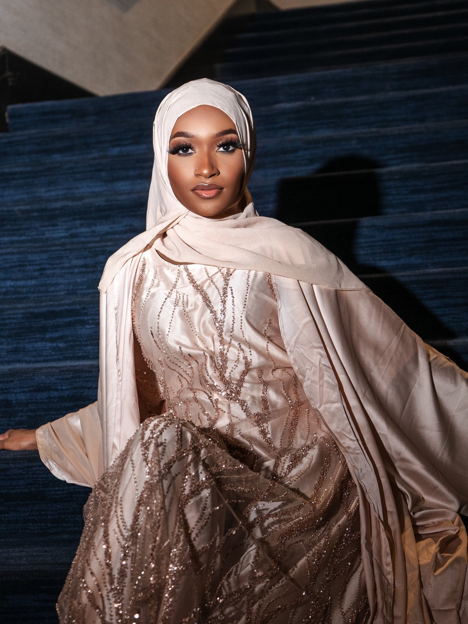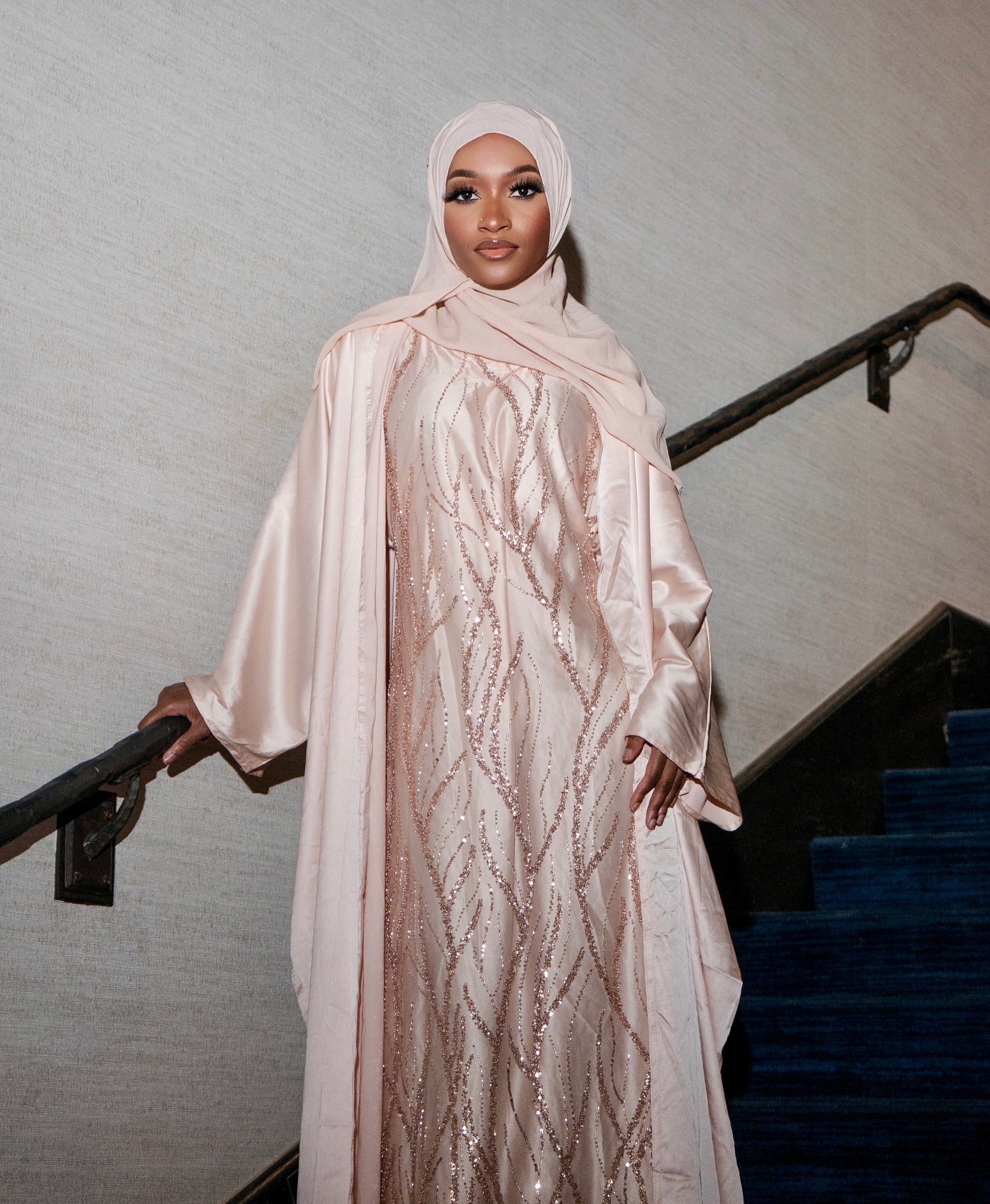 Three piece beaded abaya. Comes with inner adjustable dress, outter abaya and matching scarf.